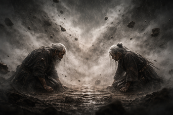Hentakan dari tekanan yang memecah keseimbangan. Kabut terurai, berhamburan ke segala arah seperti bebatuan yang terlontar dari puncak gunung meletus. Tapi medan tak sempat terbuka lama; serpihan kabut yang tercerai segera berbalik, menutup kembali ruang pertarungan dengan rapat, kembali pekat, kembali menyelubung dengan erat.