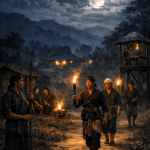 Beberapa lelaki tampak berdiri di dekat pendapa, wajah mereka tidak sepenuhnya tegang. Seorang bocah berlari kecil membawa kendi, lalu berhenti ketika melihat rombongan datang.