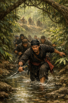 Saat itu Keling Juwana menimbang untuk menyisir tebing batu atau merayap, lantas seseorang yang berikat kepala lurik berkata, “Ki Juwana, sebaiknya kita mengambil arah melawan arus sungai. Aku hanya khawatir bagian atas dari tebing ini adalah tanah yang lunak.”